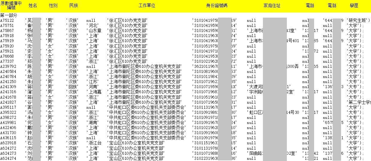 ![]() 图1:部份曝光的195万上海党员名单截图。名单截图中隐去了个人敏感信息。 |