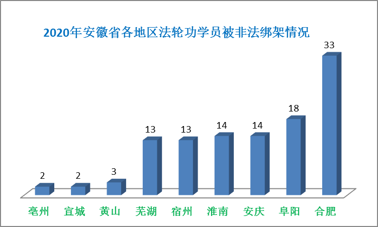 ![]() 图2、2020年安徽省各地区法轮功学员被绑架人数情况 |