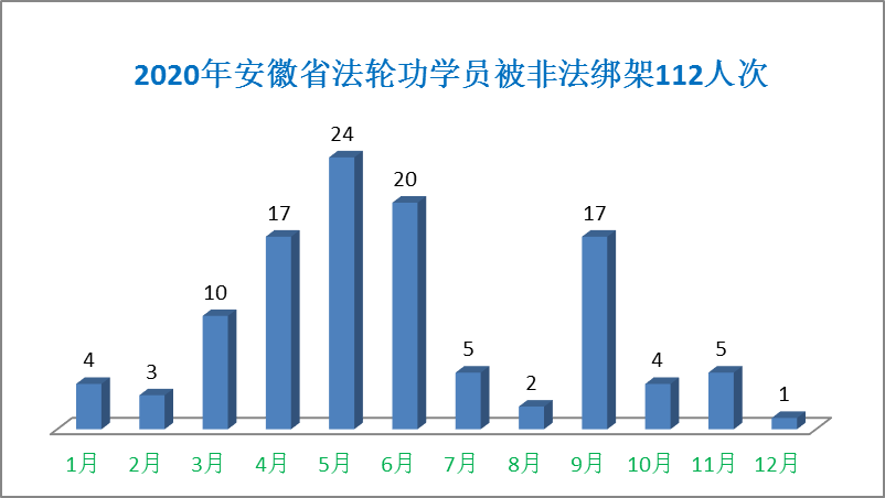 2020年,中共在安徽省绑架法轮功学员逐月人数为:一月份4人、二月份3人、三月份10人、四月份17人、五月份24人、六月份20人、七月份5人、八月份2人、九月份17人、十月份4人、十一月份5人、十二月份1人。