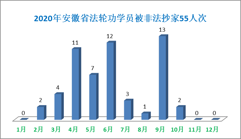 ![]() 图4、2020年1~12月安徽省法轮功学员被非法抄家人数统计 |