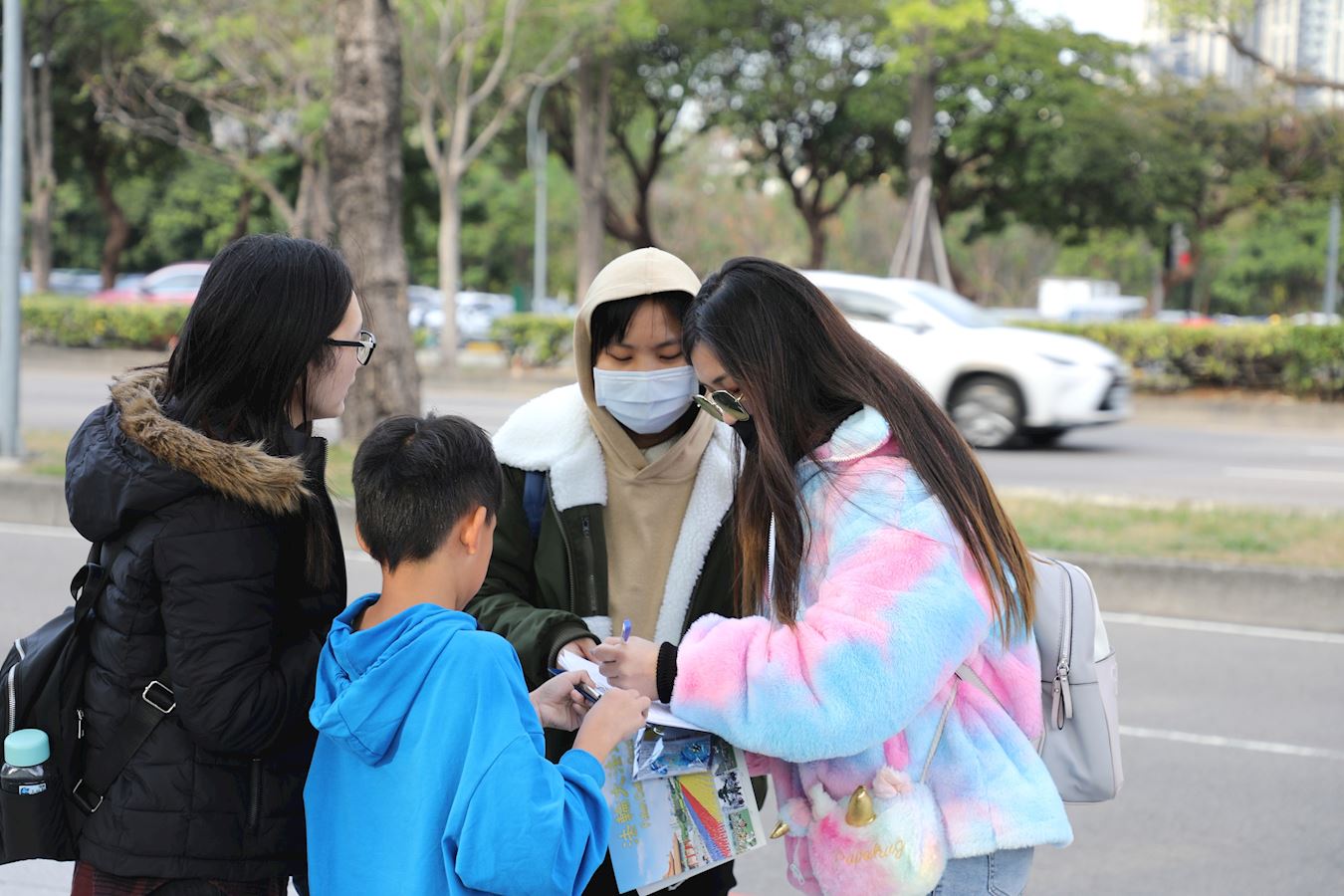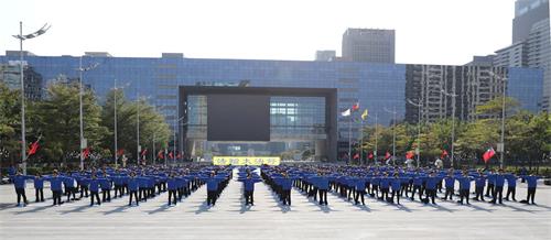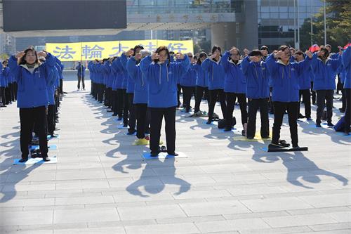 学员们集体炼功的殊胜祥和的壮观场面,吸引众多的市民和外国民众,纷纷举起手机、相机拍照摄像,有的跟着比划动作,学炼起来。来来往往的台中市民,停下匆忙的脚步提笔诉江联署,纷纷表达对良心正义的支持。