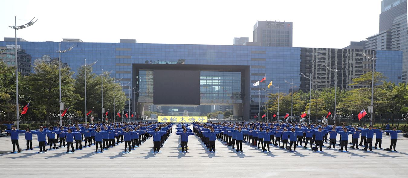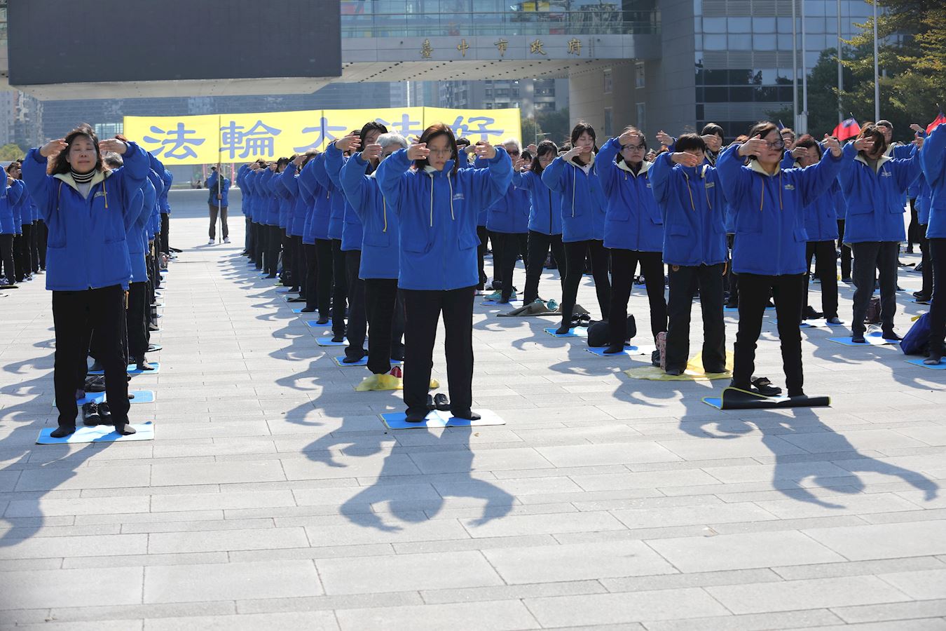 每个月的假日,来自各行各业的法轮功学员,他们在工作之余,到台中市政府广场上集体炼功,为市民展示法轮功的五套功法,传递真、善、忍的美好。方便民众前来接触与了解。学员也交流了修炼后身心受益的亲身体会。