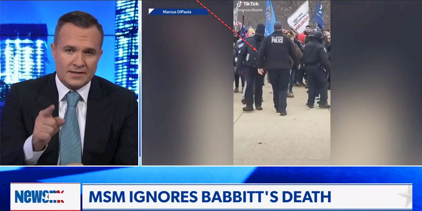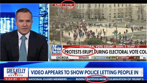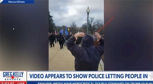 图1:Newsmax节目主持人格里-凯利(左)指出:各家到场实况转播的媒体录像显示,抗议人群被警察放行,进入了国会大楼的入口区,而不是各媒体异口同声所说的“突破”(breach)封锁线。
