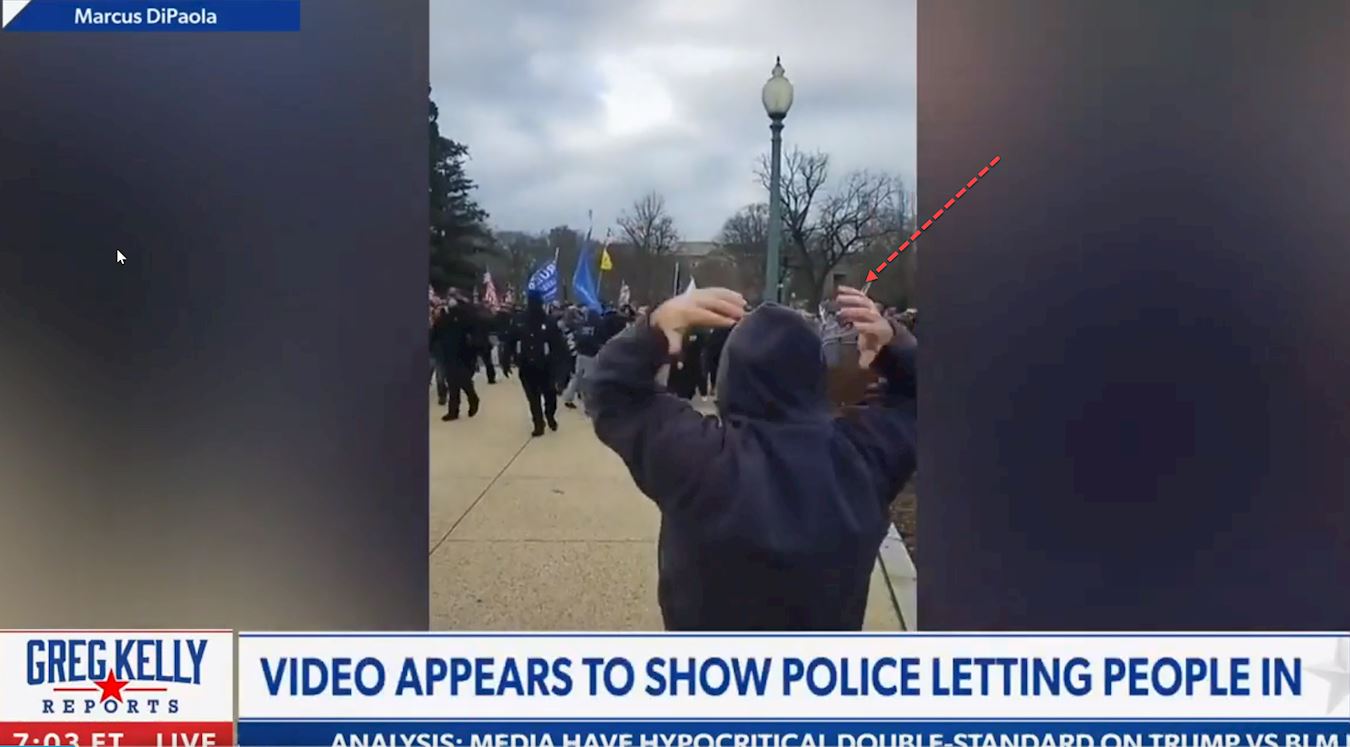 图2:媒体录像显示,抗议人群被警察放行、进入国会大楼的入口区时,背对镜头的这个人挥舞双臂为人群导流。