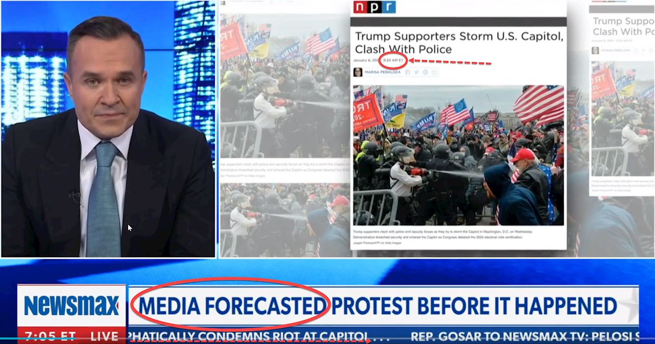 图5:Newsmax新闻截图:国家公共广播(NPR)1月6日上午9点33分就推出了“川普支持者风卷首都、与警察发生暴力冲突”的“新闻”图片