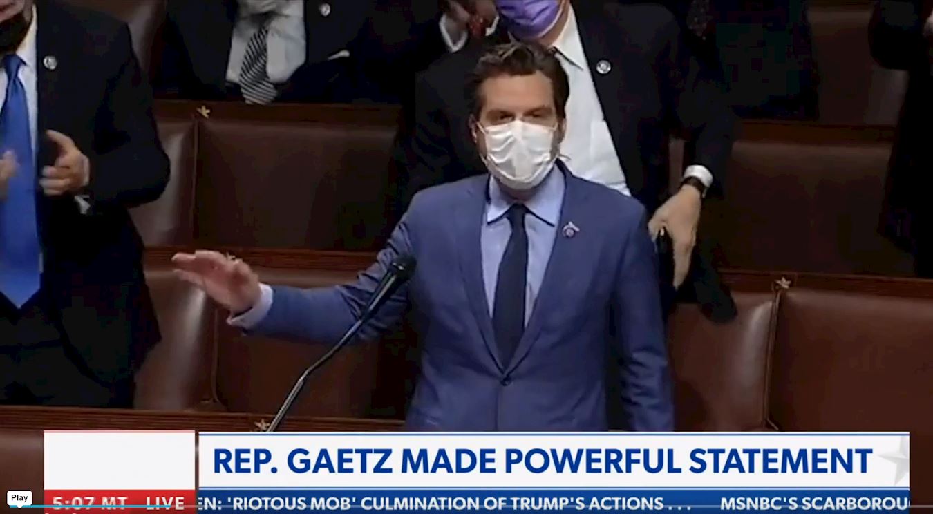 在联席会议恢复会议之后,佛州联邦众议员马特·盖茨(Matt Gaetz)说:“今天闯进国会大厦的一些人,并不是川普的支持者,他们伪装成川普支持者,实际上是暴力恐怖组织安提法的成员。
