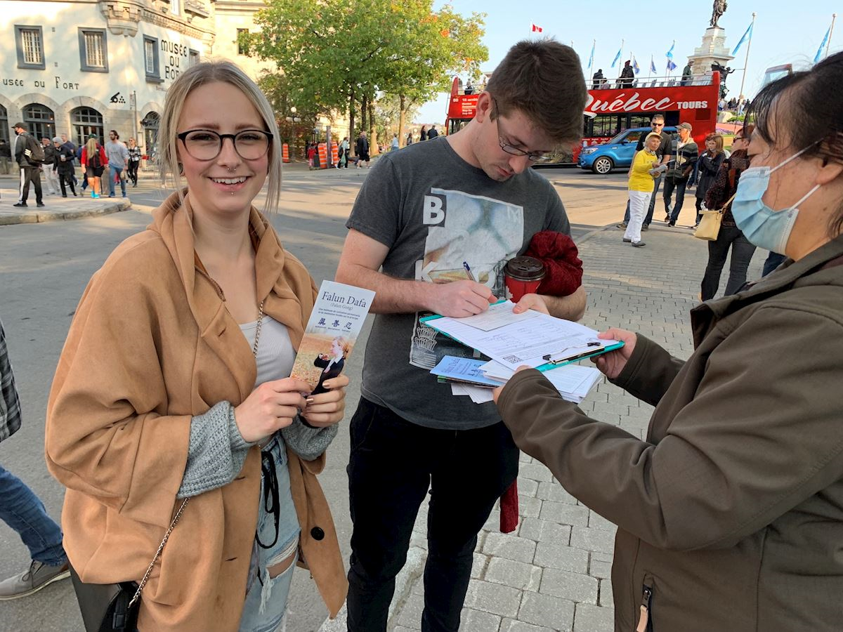![]() 图9:魁北克市的护士艾米莉(Emilie)和程序员米歇尔(Michel)在征签信上签字,表示支持法轮功学员。 |