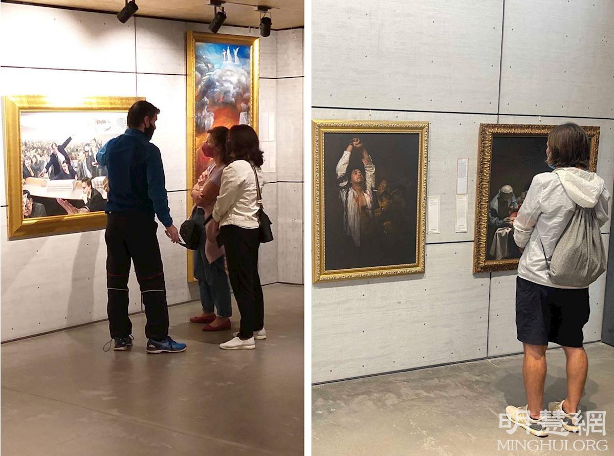 ![]() 图2~4:民众认真观看“真善忍国际美展”作品 |