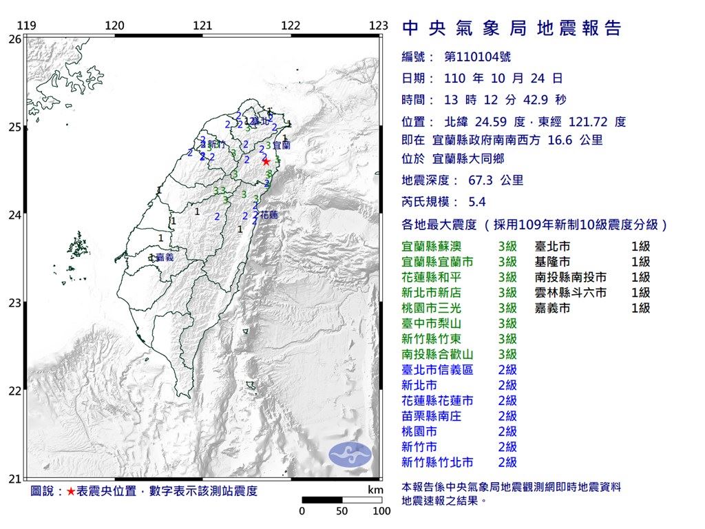 第二次地震发生在下午1点12分,芮氏规模5.4地震,地震深度67.3公里,最大震度宜兰县、花莲县、新北市、桃园市、台中市、新竹县、南投县3级。