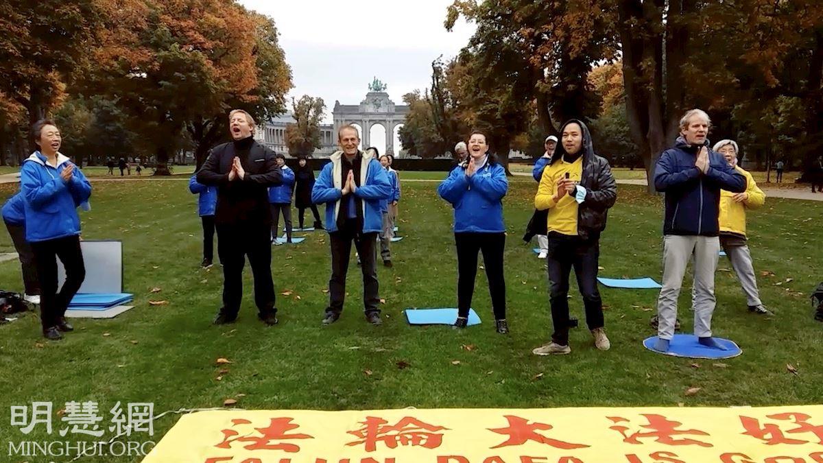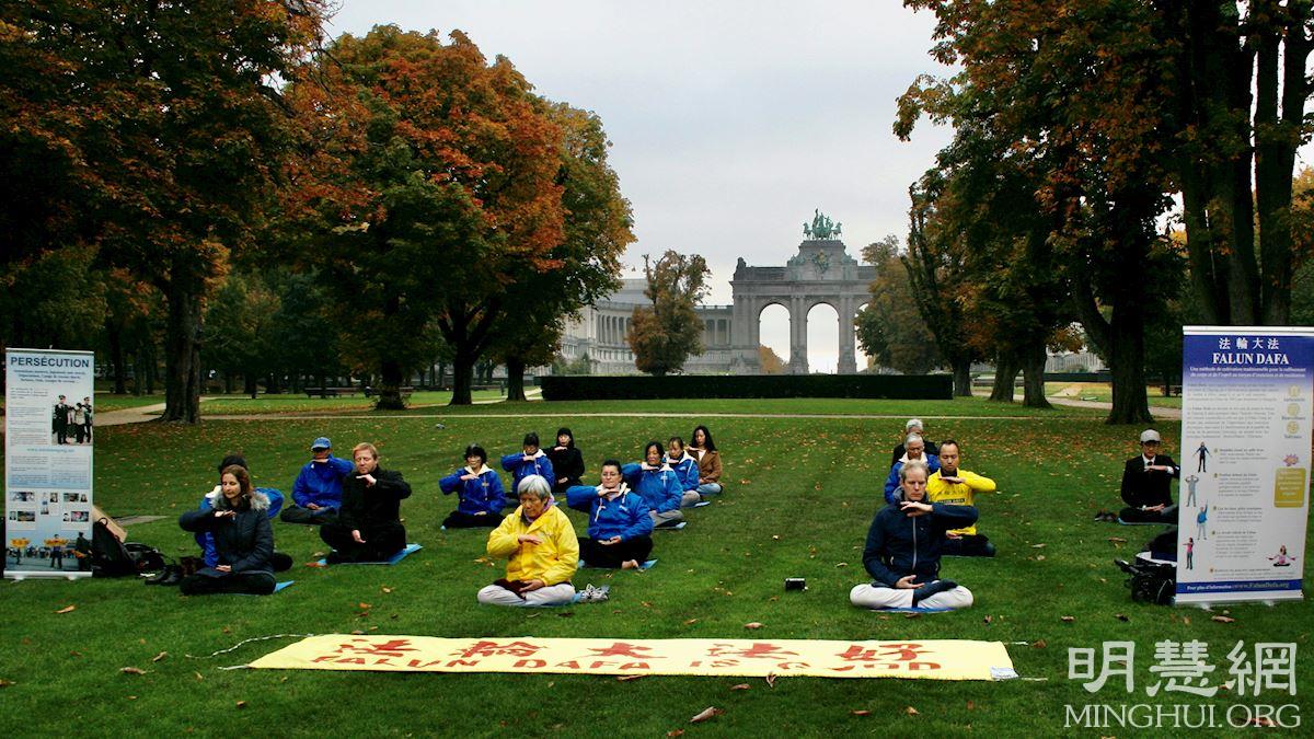 ![]() 图1:比利时法轮功学员展示功法 |