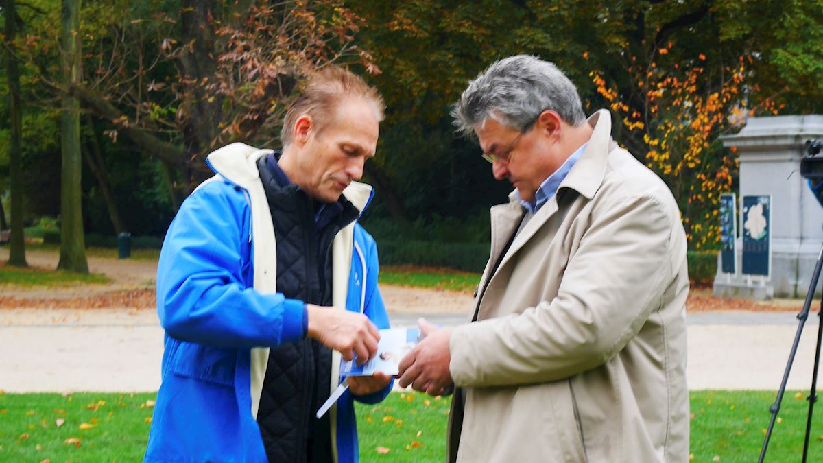 布鲁塞尔五十年宫大公园是法轮功学员每周户外炼功点。这天,“国际捍卫自由与权利联盟”成员、人权倡导者安迪·维莫来到学员中间学习法轮功功法,与学员一起炼功一个半小时。最后他提议请全体人员一起呼喊“法轮大法好”,他深感法轮功带给炼功者平静的心态,和真、善、忍指导下能够使道德回升的社会效应。