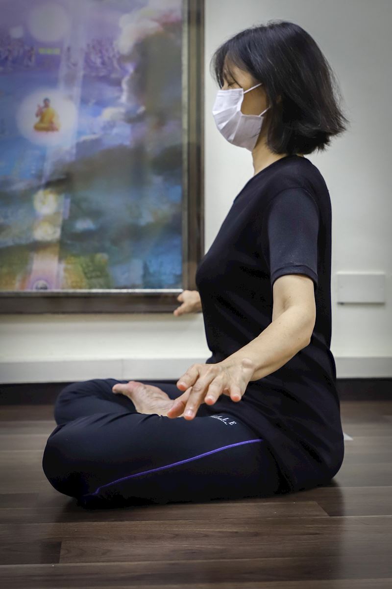'图2:一位新学员在学炼第五套功法-打坐。'