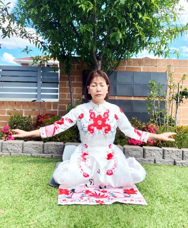 ![]() 图2:越南裔悉尼法轮功学员谭女士在炼法轮功第五套功法 |