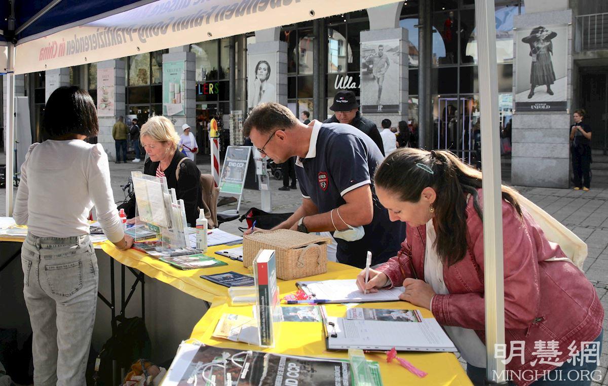 '图4:十月二日,在康士坦茨(Konstanz)的奥古斯缇纳(Augustinerplatz)广场上,了解真相后的路人签名支持制止中共活摘罪行。'