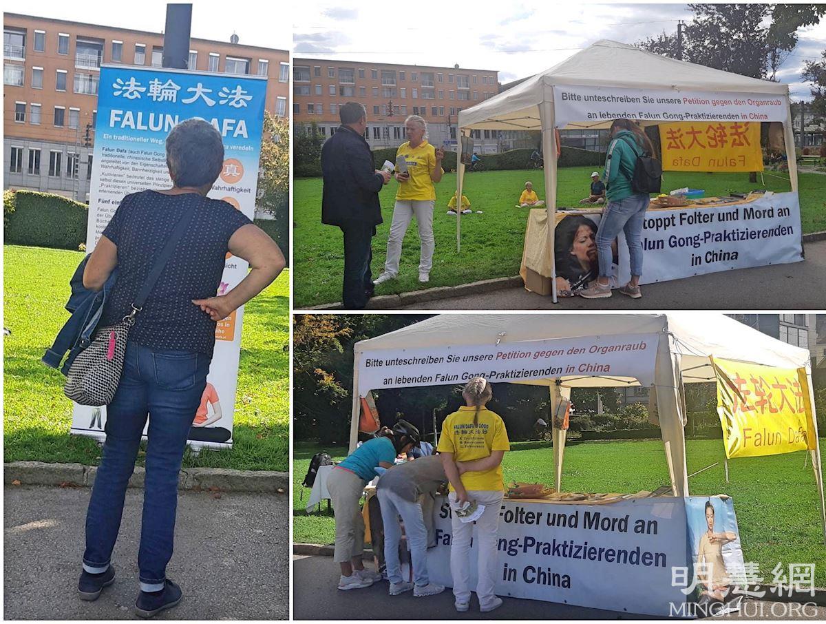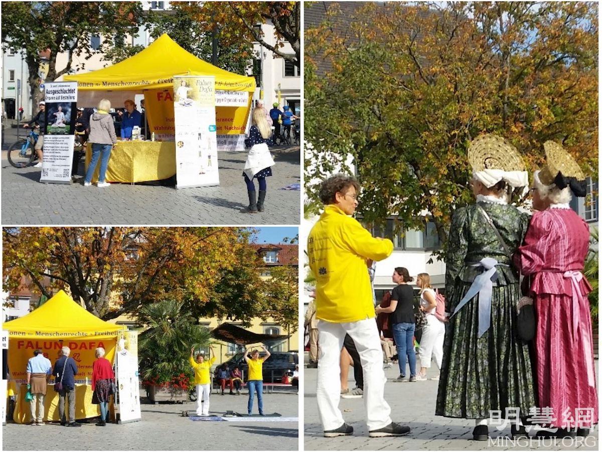 【明慧网二零二一年十月九日】(明慧欧洲记者站报道)十月的第一个周末适逢德国统一日,法轮功学员于二零二一年十月二日和三日,在德国、奥地利和瑞士共同拥有的博登湖的九座城市举办了信息日和汽车游行活动。过往路人经过真相点时,有的自行选取真相资料,仔细阅读;有的和学员交谈,了解更多的讯息;有的径直签名支持法轮功学员反迫害;还有的当场学炼功法,感受法轮大法的美好。