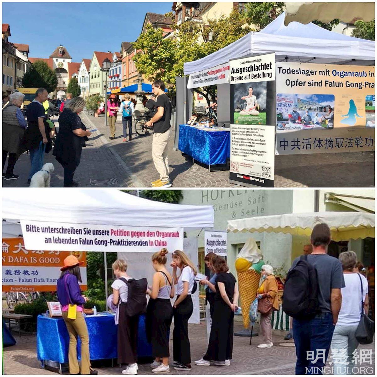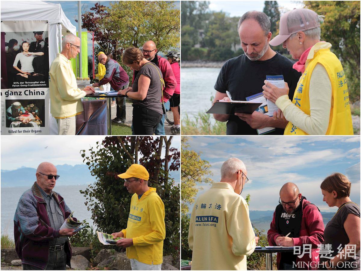 这两天,“法轮大法好”、“征集签名制止中共活摘法轮功学员的器官”、“请帮助制止迫害法轮功”等横幅和展板出现在博登湖畔(Lake Constance)的三个国家九个城市,从德国的康士坦茨(Konstanz),路德维希港(Ludwigshafen),于伯林根(Überlingen),梅尔斯堡(Meersburg),到和瑞士隔湖相望的腓特烈港(Friedrichshafen),旅游城市林道(Lindau)经过奥地利西部的布里根兹(Bregenz)至瑞士的小城洛尔沙赫(Rorschach)和罗曼宗(Romanshorn),绕湖一周,出现在热闹的市中心,火车站旁,及湖边人们休闲娱乐的场所。