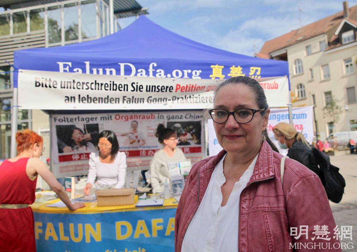 十月二日,格雷佩尔女士(Urike Graepel)在康士坦茨(Konstanz)的奥古斯缇纳(Augustinerplatz)广场上看到活摘器官的讯息后,马上驻足了解情况,并签名制止中共强摘法轮功学员器官,她边签名边流泪,签完名时,已泪流满面。
