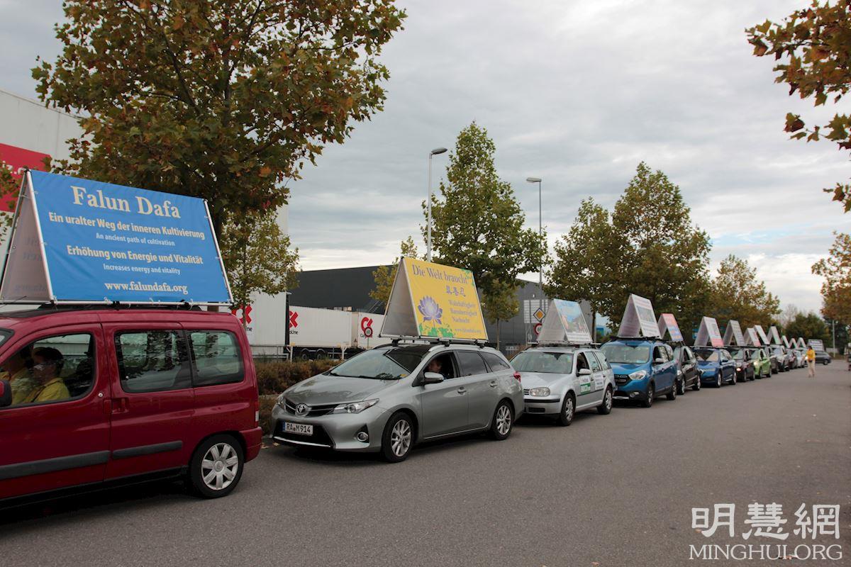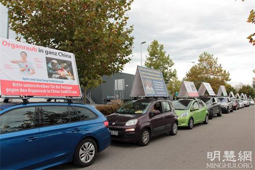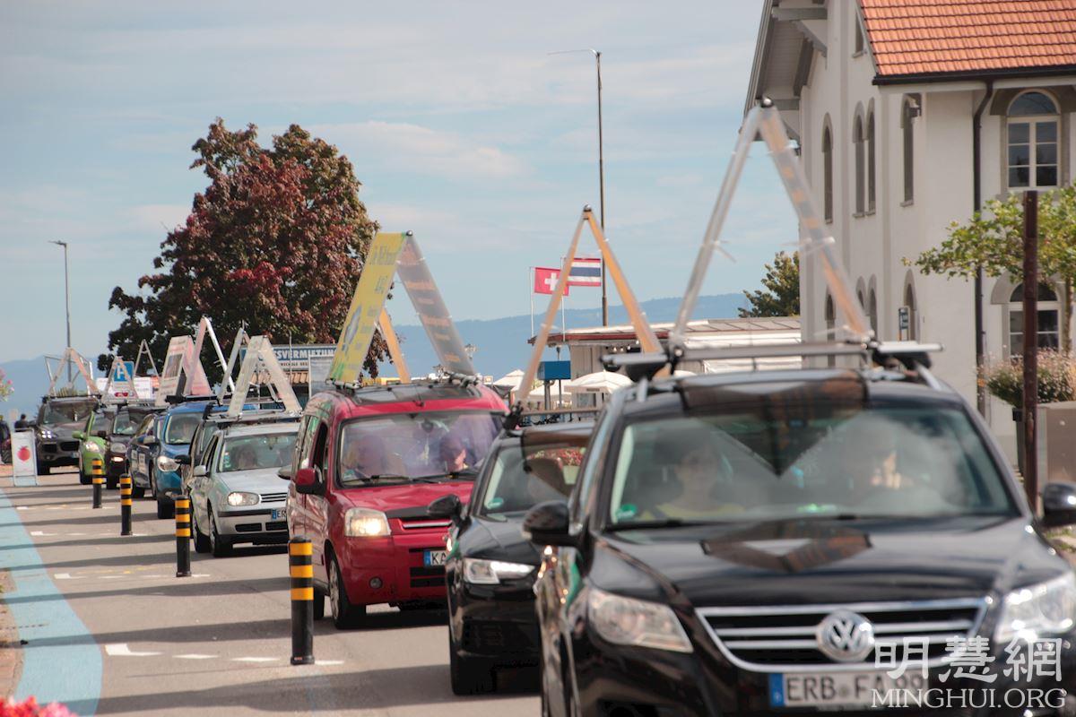 图13~15:这两天,法轮功学员除了设立真相点,并有学员组成真相车队,行驶在这九个城市间。近二十辆车的车顶上都“顶着”醒目的真相展板,告诉人们:法轮大法是一种让人身心受益的修炼功法,教人按照真善忍做个好人;中共血腥迫害法轮功,甚至被活摘器官;制止迫害,世界需要真、善、忍。