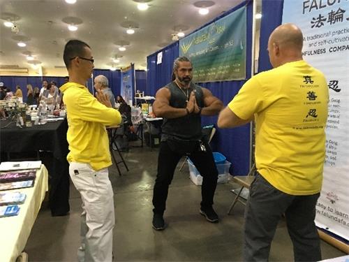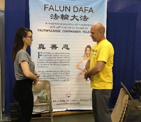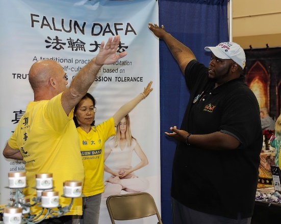 二十一日下午二点,博览会提供了一个会议场地给学员演示功法并讲述法轮功遭受迫害的真相。当地学员也把自己在学功后如何受益以及在中国遭受迫害的亲身经历告诉在场观众。会后,一位来自坦帕的老先生特地来到展位前感谢学员的付出,并对学员遭受中共的迫害感到遗憾。老先生学过太极,他说他能感受到法轮功的能量很强很舒服,他会更進一步去了解法轮大法。