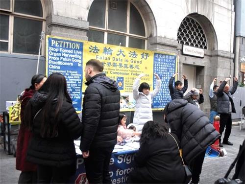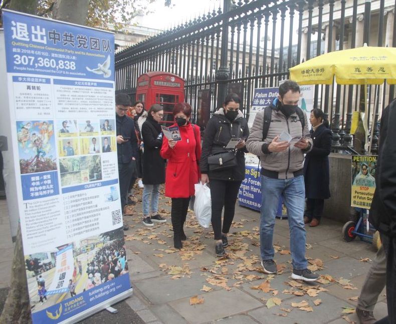 一群穿着讲究的人们走过去后,一位女士又回来,特意跟法轮功学员要了一份传单,又诚恳地说:“我知道这件事已经好几年了,谢谢你们坚持不懈地讲真相,让大家知道这件事,这真是太重要了,你们是好样的, 谢谢你们。”