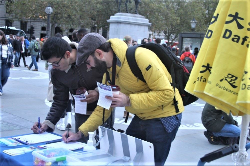 约翰·斯多克斯在请愿表上签了他的名字,然后对一位法轮功学员说:“全世界都被感染了,但一般来说,我不认为现在世界上对正在发生的这个事情有充分的了解,几乎就象是对病毒的了解,有多少人知道这种种族灭绝正在发生,不是很多,只有你们站在这里,告诉我们正在发生什么。相比于人权,人们更关心金钱和生意,这才是问题。归根结底,是人性的贪婪。但任何的强权都不会长久的。谢谢你们,我下周还会来。”