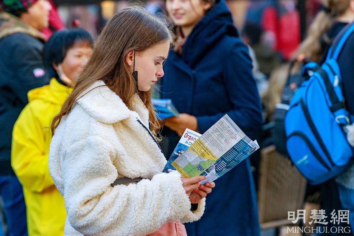 偶尔从附近城市到慕尼黑来的教育工作者迪尔夫妇(Niklauda 和 Werner Dill)观看并录下了法轮功学员的游行队伍,觉得“非常美妙与平和”,他们在玛利亚广场签名制止中共活摘法轮功学员器官,“我听说过中国盗取器官的丑闻,令人无法承受。”迪尔太太说,“他们(中共)对待人的方式远离人性,不能这样下去了。”