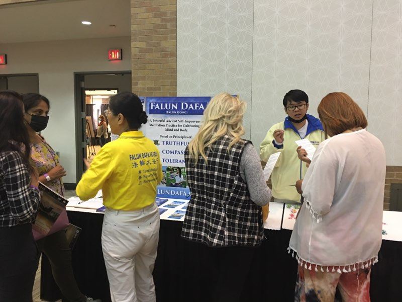 凯特(Kate)女士是一家通讯公司的电子工程师,她看到法轮功学员的展位感到惊喜,因为她一直喜欢打坐,她说因疫情的关系她一直在家上班,就在想要学一种功法,提升自己的精神。她认真地听了法轮功学员的介绍后,认为法轮功对人的身体健康的益处和对人思想境界的提高正是自己要寻到的,让她很倾心,一定会学。