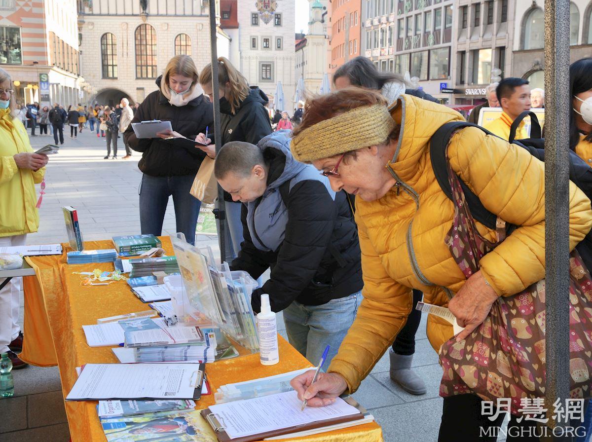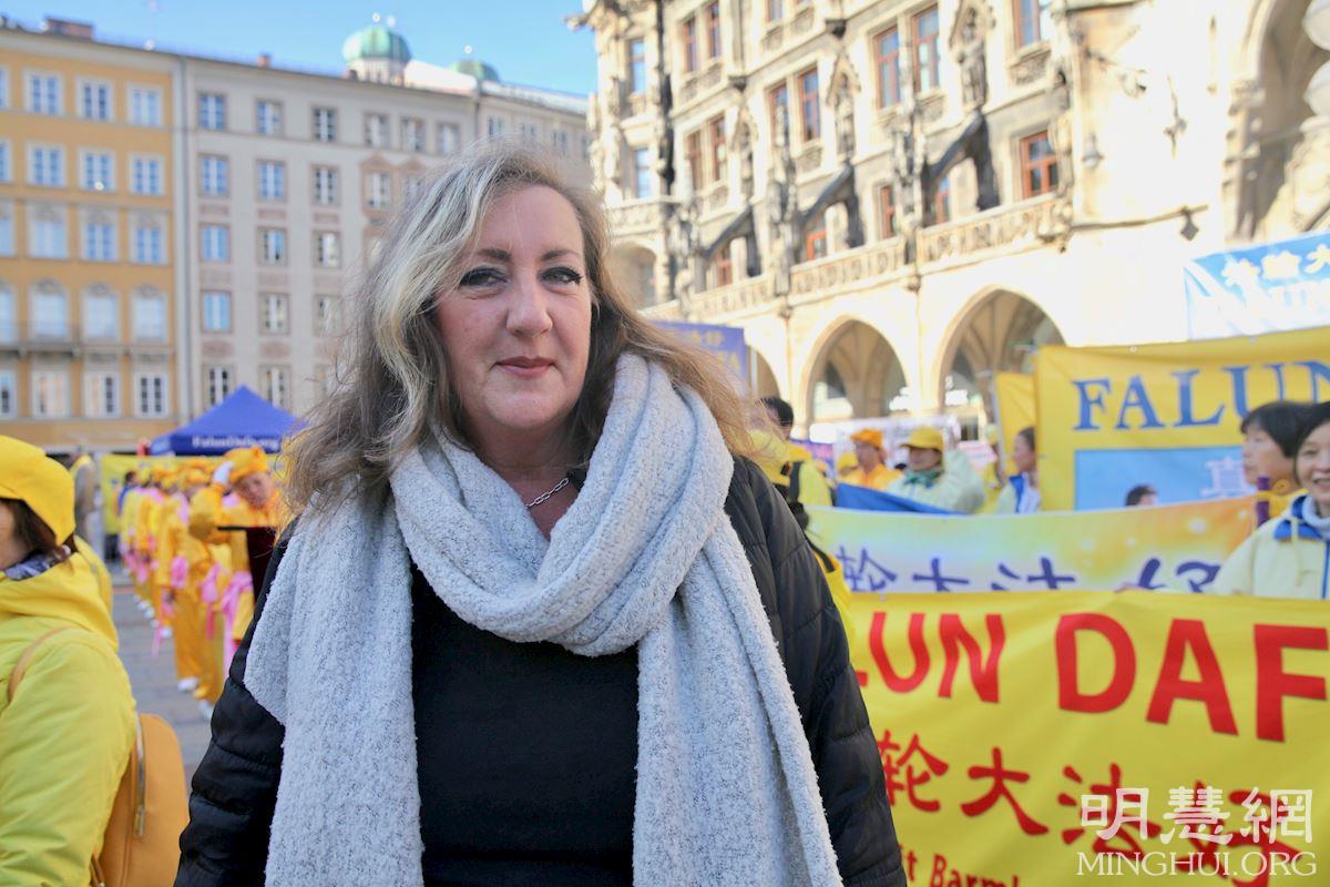 十月二十九日,当记者葛佐拉(Bettina Gorzolla)路过玛利亚广场(Marienplatz)时,看到法轮功学员的集会很感动,并签名声援法轮功学员反迫害。她认为,中共发展了共产主义和非人道行为,并向其它国家蔓延,法轮功学员站出来反迫害很重要。