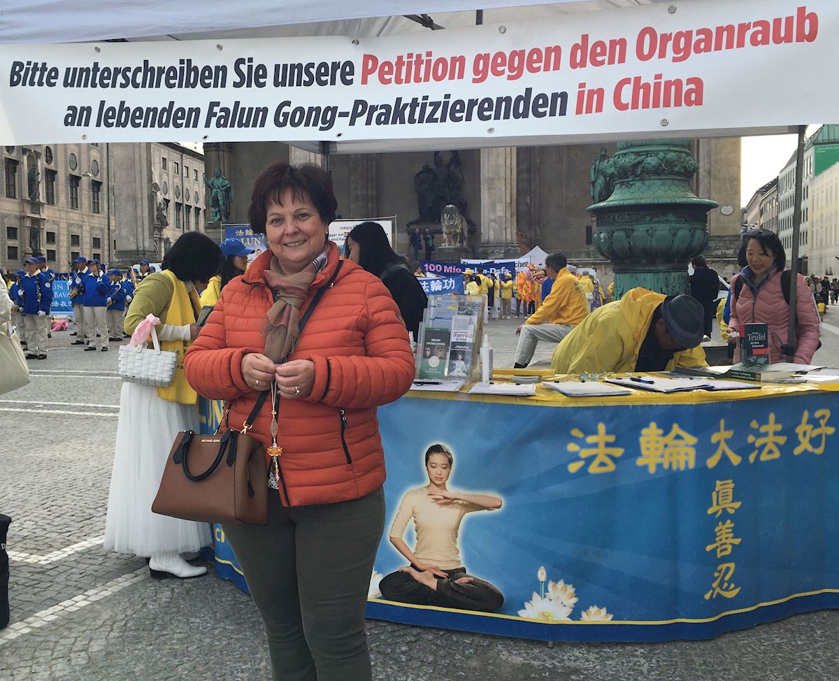 她很想进一步了解法轮功。学员告诉她,法轮功学员每周六在慕尼黑市中心都会举办信息日活动。她表示一定会去看看。