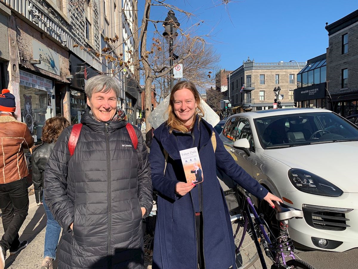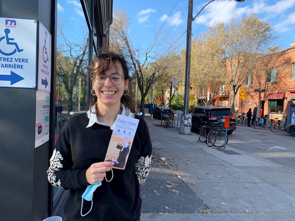 蒙特利尔市民高迪艾(Gauthier)看到游行队伍时特别欣喜。她仔细阅读了法轮大法传单后说, “这是个让人十分受益的功法,我非常高兴遇见他们。”她说,“这场游行很重要,让人有机会对法轮大法有更多的了解,也让我更加关注发生在中国的迫害,特别是活摘器官。”