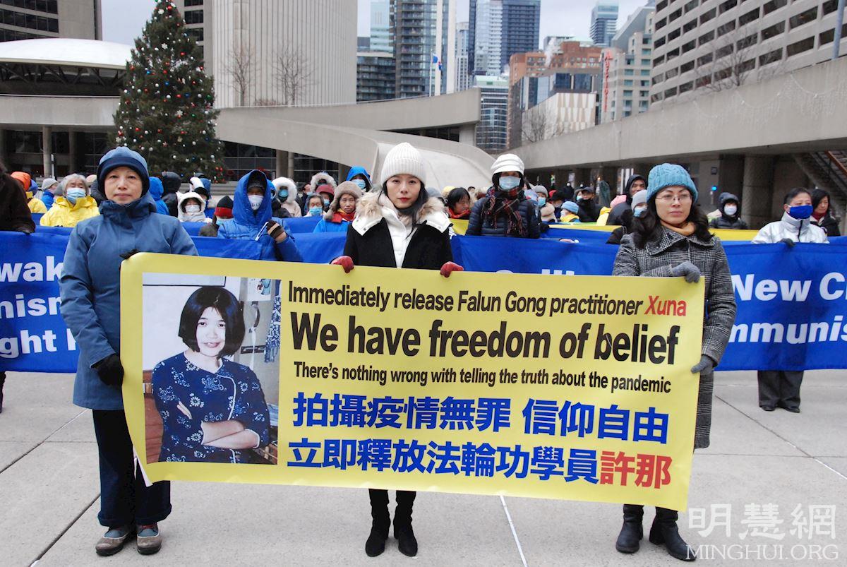 多伦多谢尔丹学院(Sheridan College)动画专业的学生刘铭园,在集会上发言,呼吁加拿大政府营救在中国被非法抓捕的母亲刘艳。刘艳女士在中国大陆因为修炼法轮功曾多次被抓捕。