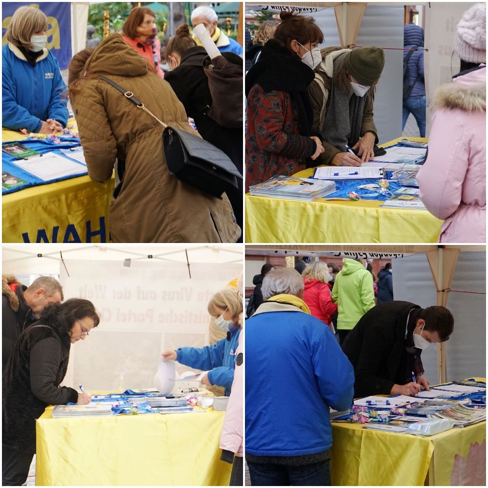 学员告诉他们说,世界各国法轮功学员正在发起反迫害征签活动。去年九月中共外长来德国时,学员向德国外交部递交了在德国征集的三万五千个签名。太太立即说:“如果签名能帮助制止迫害,那我们当然要签。”随后他们签了名。