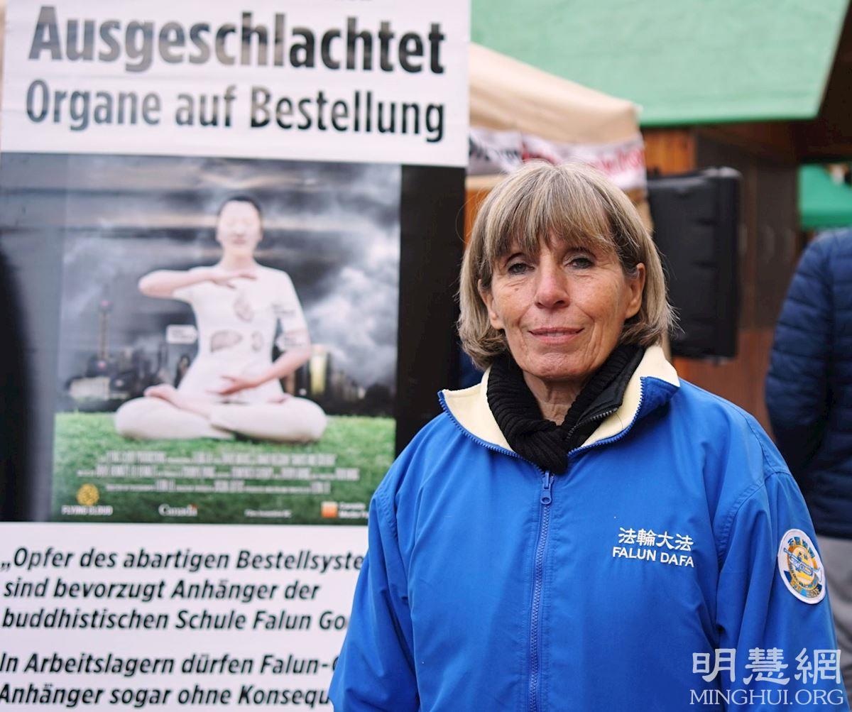 一对德国中年夫妇接过传单,太太睁大眼睛盯着真相展板,展板上有位中国女子满脸鲜血、脖子上架着电棍,同时一只大手正试图扒开她的嘴,“发生什么事了?”她指着那张图片问,学员回答,“在中国,禁止人们相信真、善、忍。法轮功学员因为不愿放弃自己的信仰,遭到绑架、判刑甚至被活摘器官。”她立刻说:“这太可怕了。”
