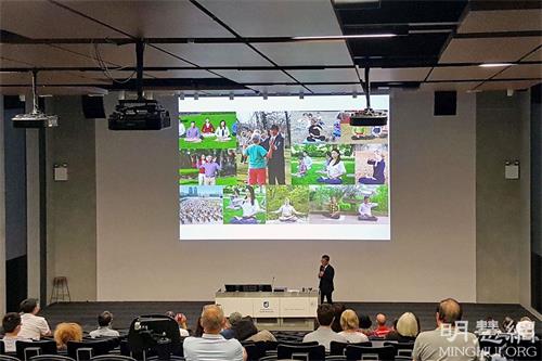 影片结束后,当地法轮功学员进一步介绍了法轮功及学员遭受到的中共的迫害,并展示了部份在市场上贩售的中共劳教所的奴工产品。一位学员通过翻译讲述了自己曾因为信仰真、善、忍被非法判刑,遭受中共的劳教和监禁迫害的经历。