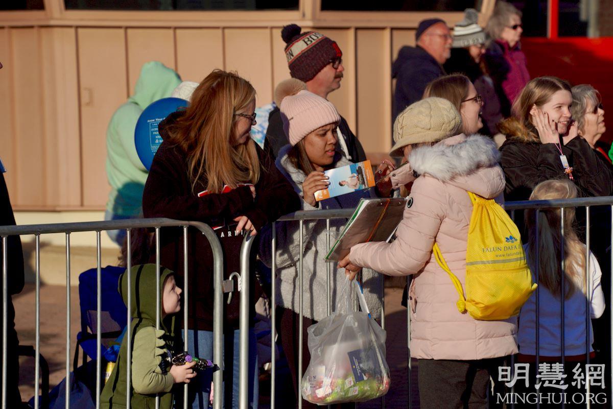 在游行期间,法轮功学员还给观众发放了真相资料。很多民众在支持法轮功反迫害的征签表上签了名。