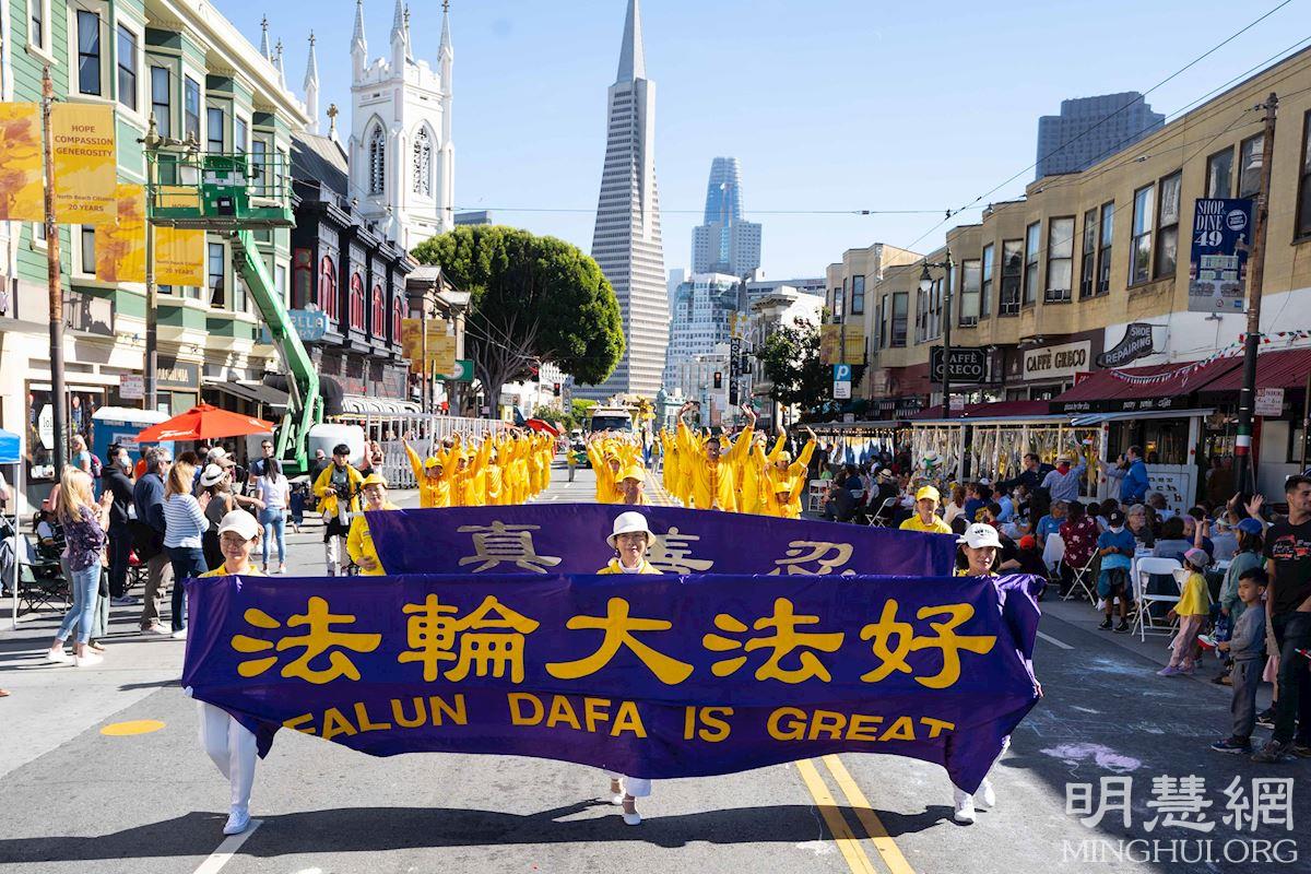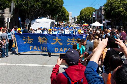 旧金山湾区的法轮功学员多年来年年参加应邀参加旧金山的复活节游行,受到主办方和观众的欢迎。二零一八年的复活节游行,游行主办者、旧金山联合街区协会主席埃莉诺·卡彭特(Eleanor Carpenter)感谢法轮功学员前来参加。她说:“法轮功的队伍是整个游行队伍中最棒的,无可比拟,他们的参加让我们深感自豪。”看着法轮功真相小册子,她说,作为生意人,她常感到压力,她需要炼法轮功,减缓压力。