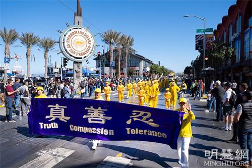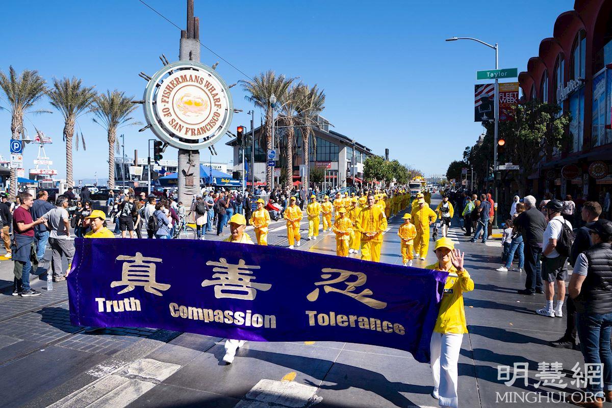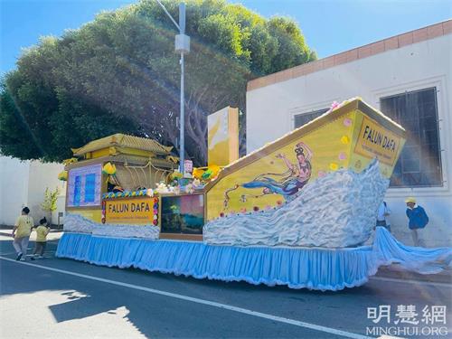 而在位于美国西海岸的旧金山,于二零二一年十月十日,举办了一年一度的哥伦布日游行,今年改名为意大利传统日游行,北加州法轮功学员以天国乐团、炼功队和花车再次应邀参加,受到主办方和观众的欢迎,花车获得一等奖、天国乐队获得二等奖、炼功队获得三等奖。当地居民说,我们都爱法轮大法。
