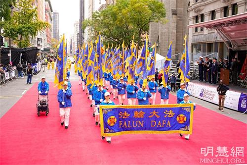 ![]() 图20~22:二零二一年十月十一日,法轮功学员的天国乐团、旗阵、炼功队与腰鼓队参加了纽约第七十七届哥伦布日游行,在游行队伍中,非常亮眼。法轮功学员的演奏,鼓乐声声都传递着真、善、忍的信息,给观众留下深刻印象。观众纷纷表示法轮功队伍独特出众,非常棒,他们很喜欢。 |