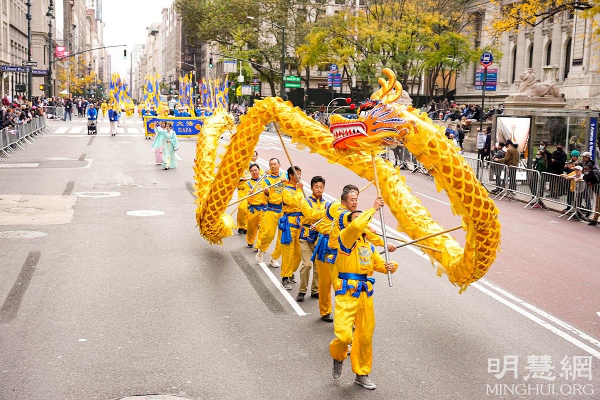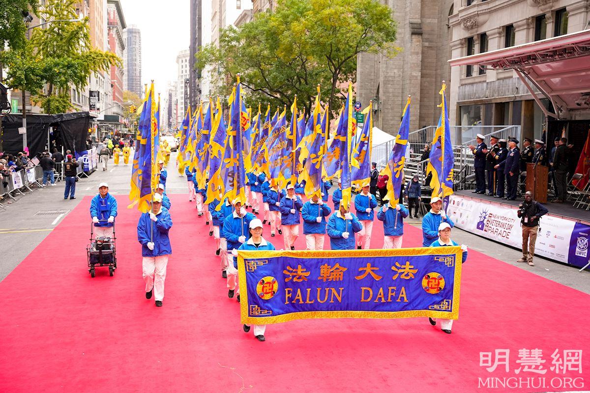 去年因受中共病毒疫情影响,纽约的老兵节游行取消了,今年,二零二一年十一月十一日,纽约市传统的老兵节游行重返曼哈顿第五大道,法轮功队伍再度受邀参加,两旁民众有的高呼:法轮大法好(Falun Dafa is Good);有的对法轮功学员合十,有的感动得眼泪都要出来。