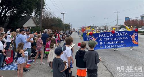 法轮功学员的队伍经过主席台时,主持人特蕾西·米克曼(Tracy Meekman)女士向观众介绍说,法轮大法的原则是真、善、忍,法轮大法是改善身心健康的修炼。她说,“他们(法轮功学员)的队伍色彩绚丽,他们还教导我们到底发生了什么。我们非常感激法轮功学员每年参加游行。”
