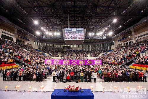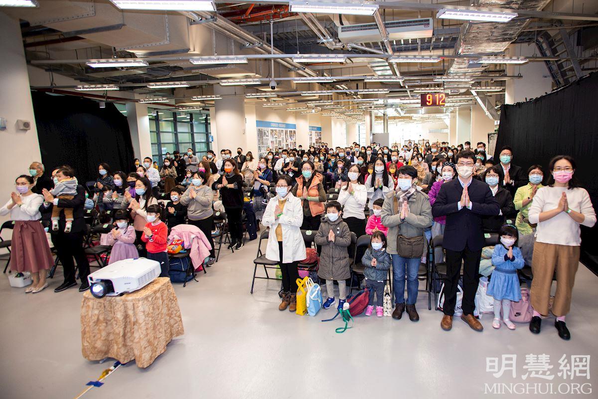 交流会开始前、六千多位来自全台各地的法轮功学员,不论在主厅或台语厅、儿童厅,都全数起立合十,怀着无比感恩的心,向法轮功创始人李洪志先生拜早年,齐声“恭祝师父新年好!”