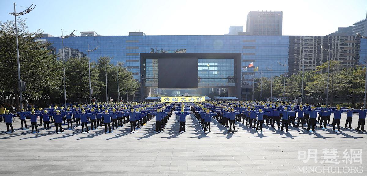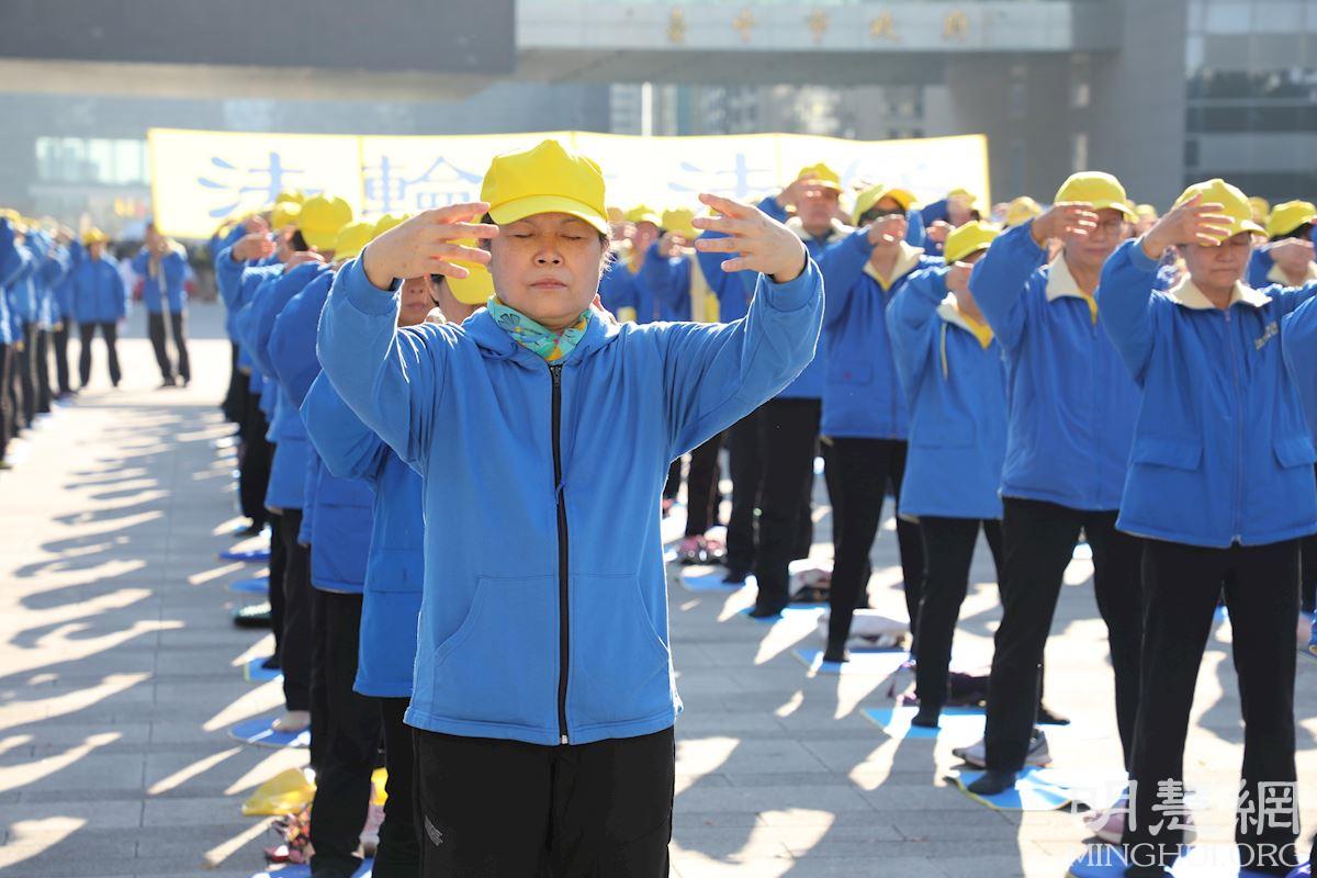当日冬阳暖照,台湾大道上熙来攘往的车流与广场上祥和的炼功画面形成对比,吸引过往的行人驻足拍照,也有在一旁观看的民众跟随比划起动作来。学员向过往的行人派送资料、介绍法轮功,同时征签声援法轮功反迫害。