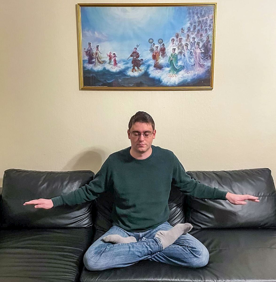 ![]() 图2:菲利普盘腿打坐在炼法轮功的第五套功法——神通加持法。 |