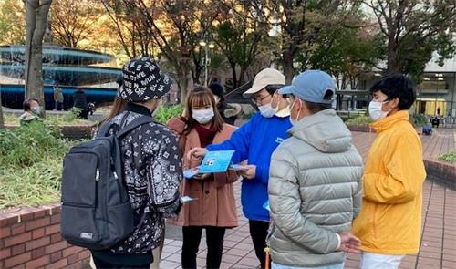 ![]() 图1:十一月二十八日,法轮功学员在日本名古屋市荣的喷水附近炼功 |