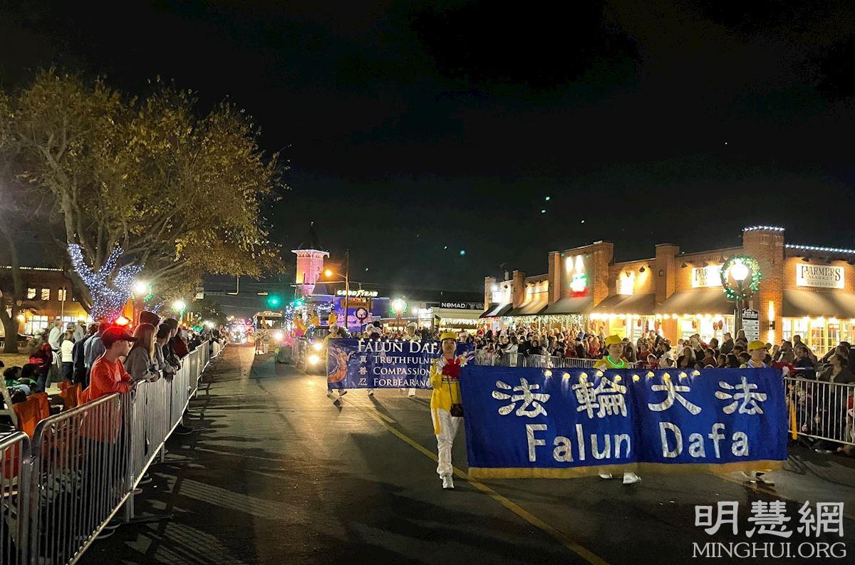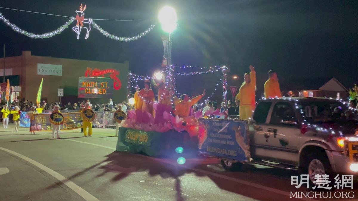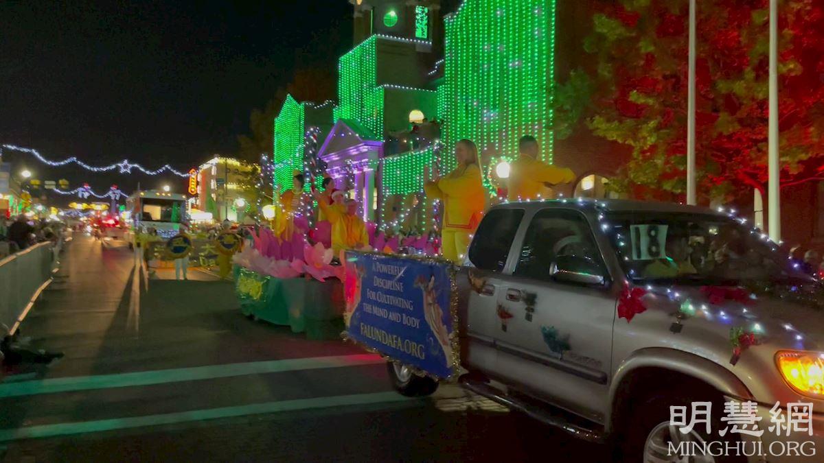 法轮功学员的队伍由横幅队伍和花车组成,是百个团体中唯一的亚裔团队。学员们举着“法轮大法”、“真、善、忍”、“法轮大法好”等色彩鲜艳的横幅,花车上还有学员在展示优美、舒展的法轮功功法,整个队伍散发着祥和的能量。很多观众对着法轮功学员队伍挥手致意,大声的喊着:“法轮大法”、“太漂亮了”,“圣诞快乐”。