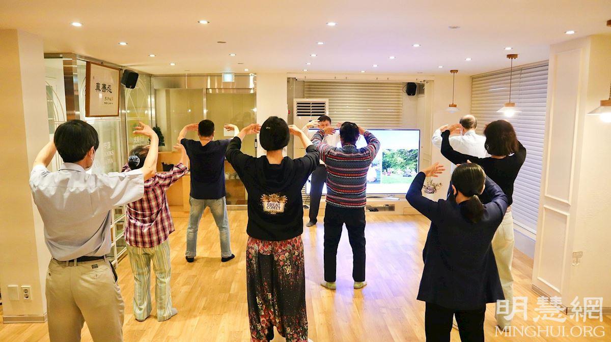 ![]() 图2:参加十月份九天班的新学员正在学习法轮大法第五套功法。 |