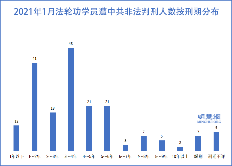 图1:2021年1月法轮功学员遭中共非法判刑人数按刑期分布