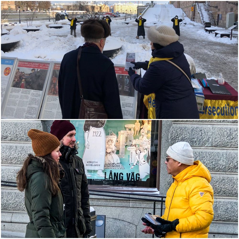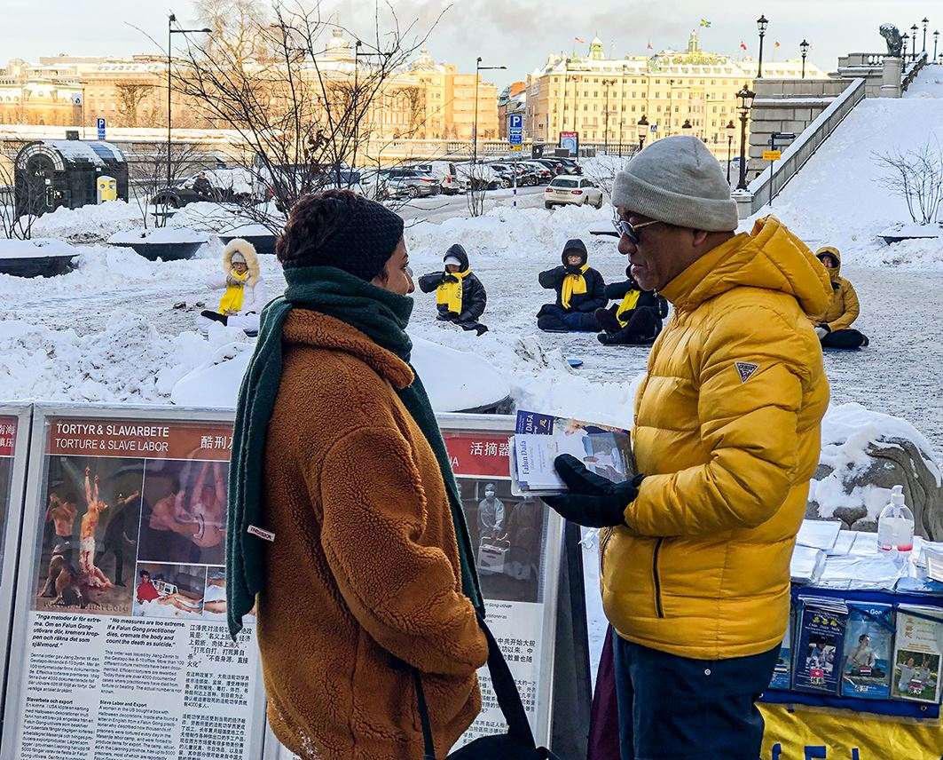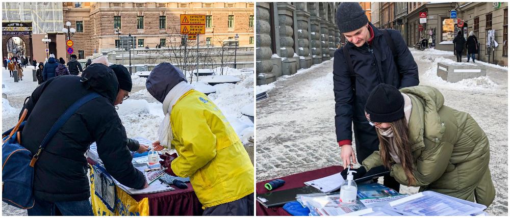 活动当天天气寒冷,瑞典政府目前的限令是,活动不能超过八人。法轮功学员们的现场气氛宁静祥和、充满能量,给寒风中匆匆行进中的人们带来了温暖和希望。很多路人驻足观看并和学员交谈,当人们了解真相后,都愿意签名支持并谴责中共的残暴。
