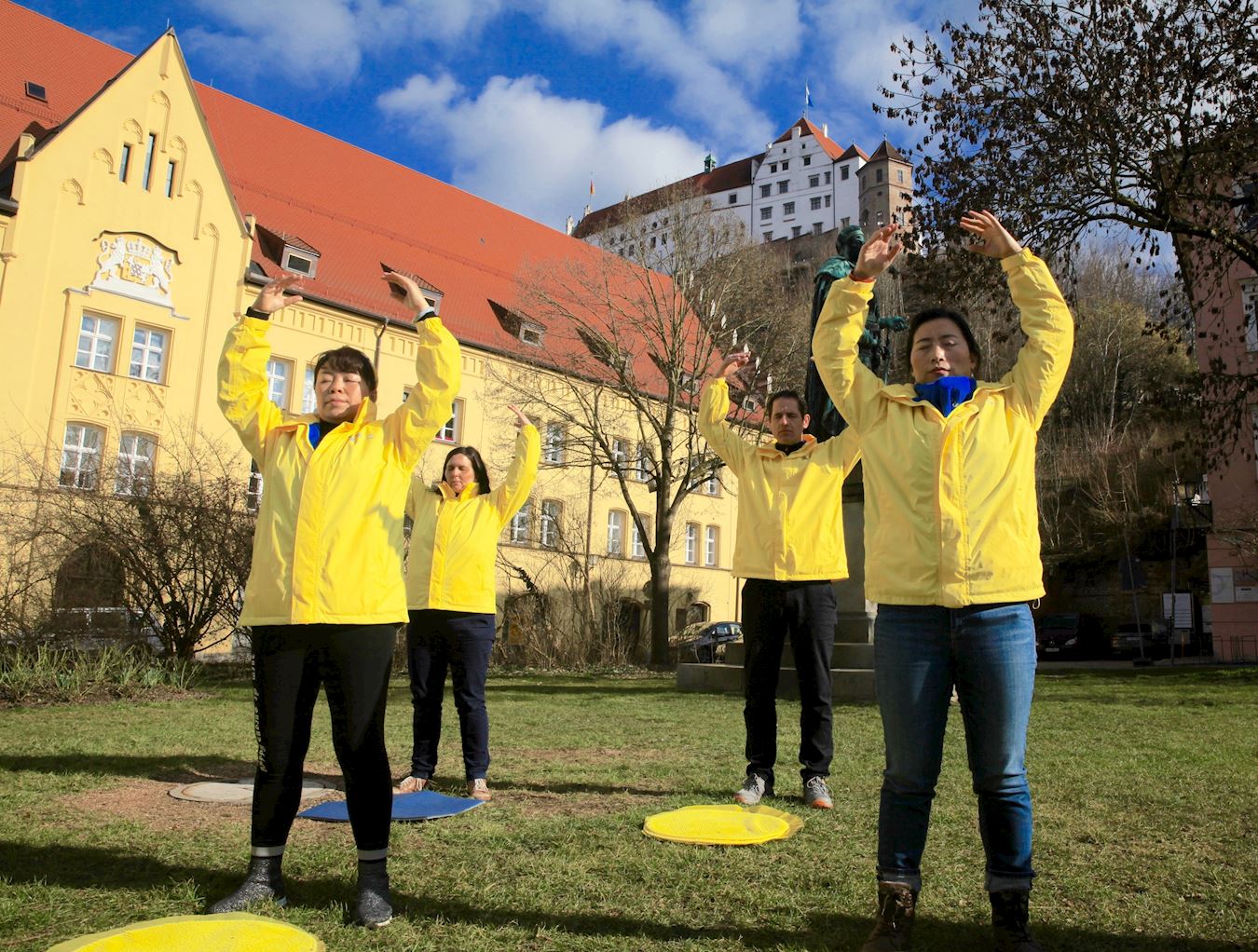 法轮功学员的展位设在三位一体广场(Dreifaltigkeitsplatz),可以看到当地著名的特劳斯尼茨城堡(Burg Trausnitz)和圣马丁教堂。阳光下,法轮功学员黄色外套与蓝天、城堡交融,引人注目。一些民众停下脚步跟法轮功学员交谈。当人们了解到法轮功真相时,特别是中共活摘法轮功学员器官,中共对疫情的隐瞒以及对国际社会的危害之后,不少人签名声援法轮功学员反迫害。