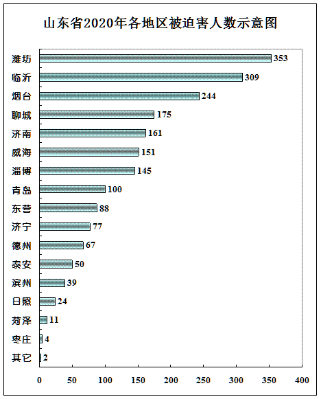 按地区被迫害人数排列,依次为:潍坊市353人、临沂市309人、烟台市244人、聊城市175人、济南市161人、威海市151人、淄博市145人、青岛市100人、东营市88人、济宁市77人、德州市67人、泰安市50人、滨州市39人、日照市24人、菏泽市11人、枣庄市4人等。